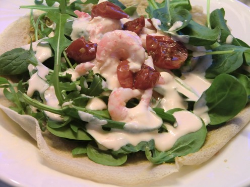 Den franske boghvedepandekage, der bruges som madpandekage, kendes også under navnet galette. En klassisk galette indeholder emmentaler-ost, en skive skinke og et æg, men denne opskrift er på en lidt anden type galette, hvor ingredienserne pesto, spinat, rucola og rejer er indbefattet. Det skal da prøves, skal det ikke?