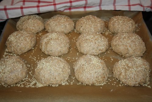 - Pensel evt. bollerne med lidt mælk og hæld sesamfrø på (så får de et flot look)